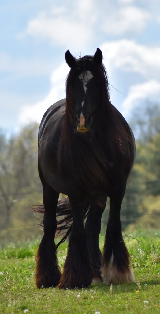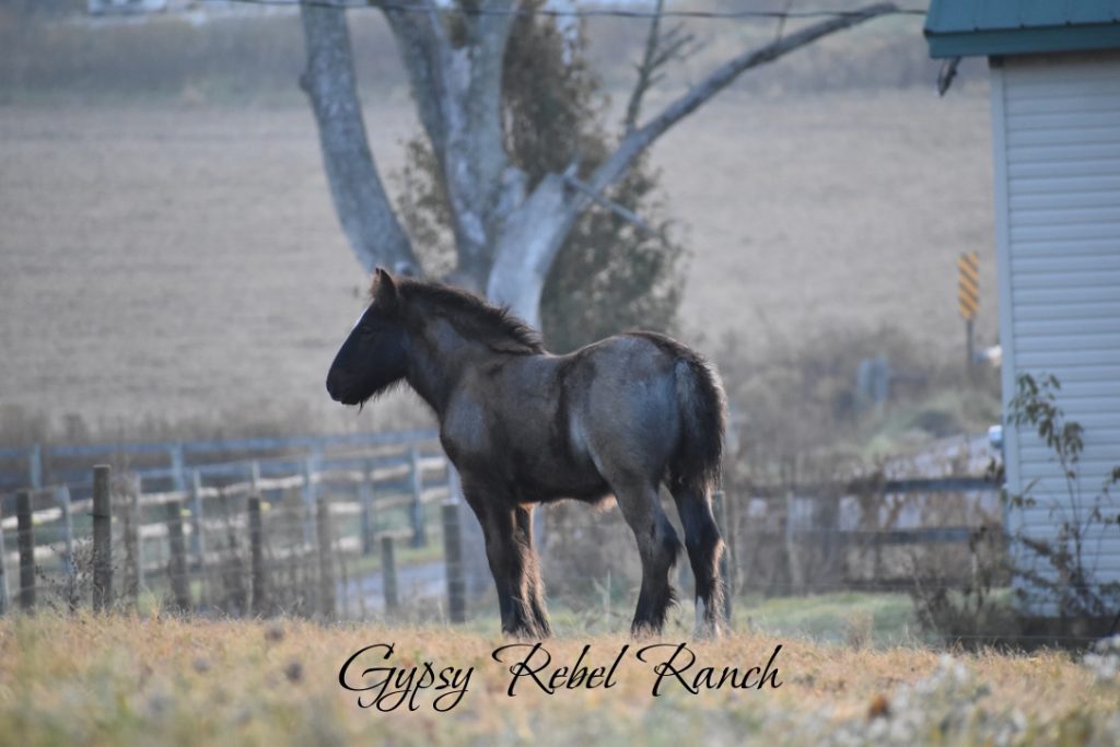 Homozygous Black- Standing 14.1 hands with mane to her knees- she goes back to some of the very first original Gypsies in the US as well as having some of my most favorite imported lines. With a big booty, a thick neck, hair for days and a laid back personality, this girl is not hard to love.